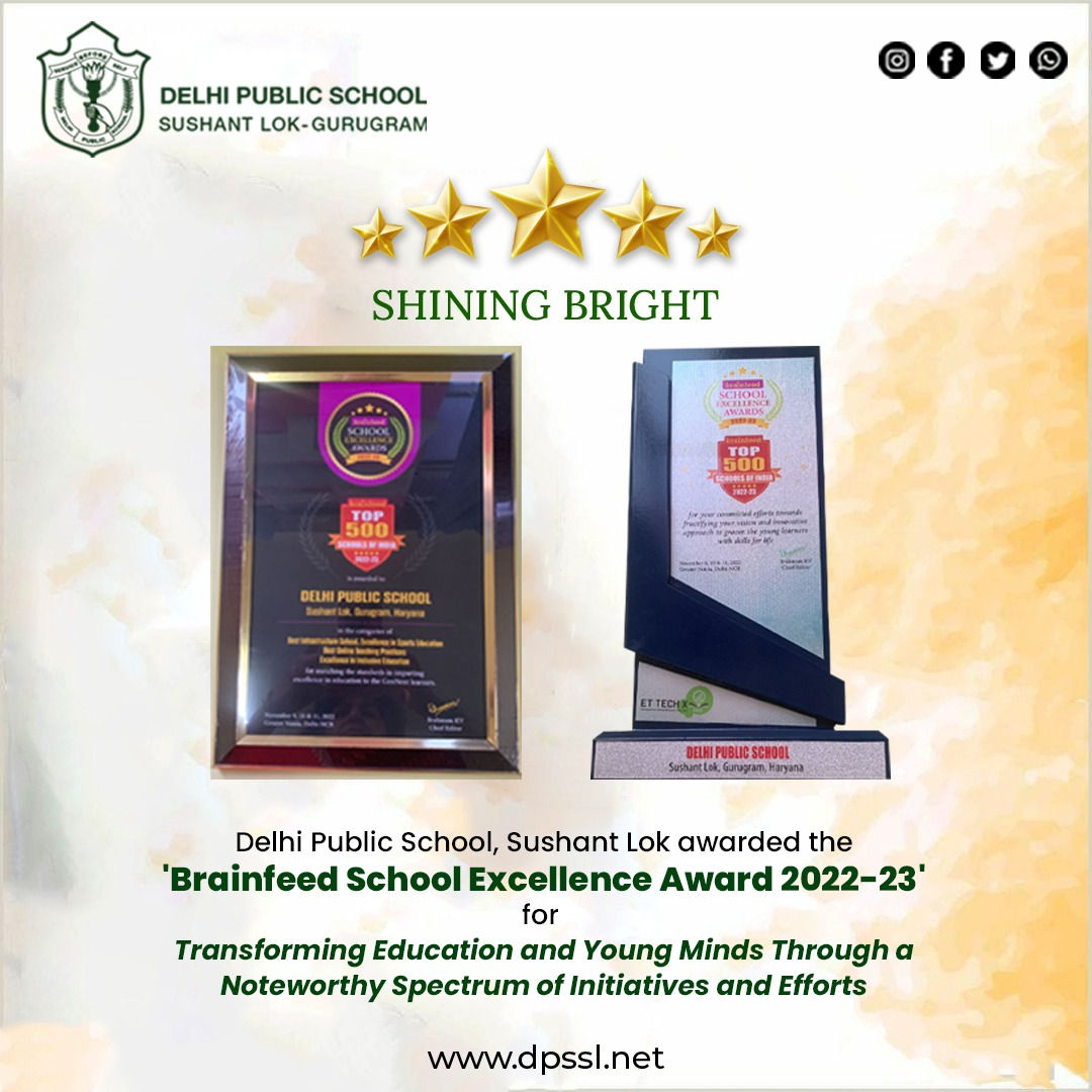 Ranked among the top schools of India, we take pride in announcing that Delhi Public School, Sushant Lok -Gurugram has won the prestigious Brainfeed School Excellence Award 2022-23 in the category for Transforming Education and Young Minds Through a Noteworthy Spectrum of Initiatives and Efforts.