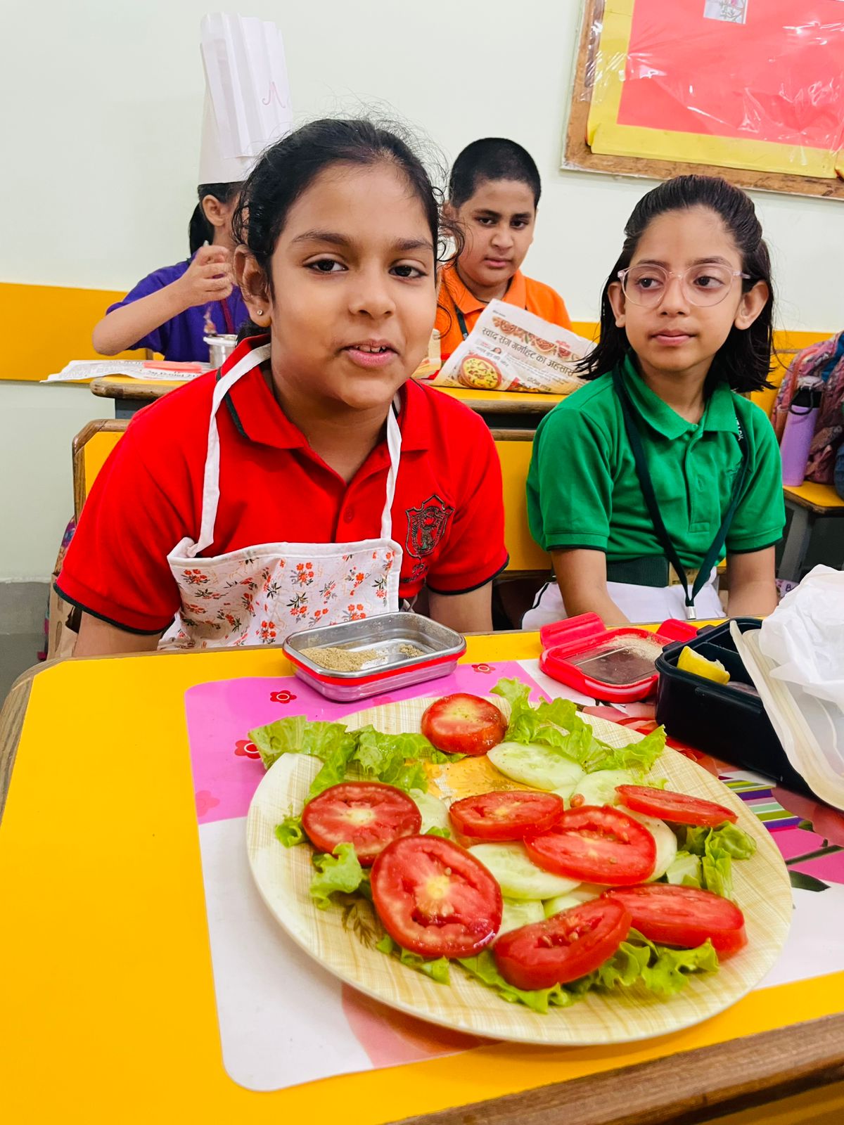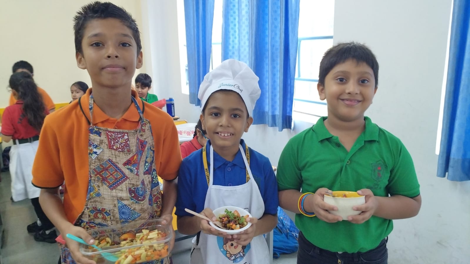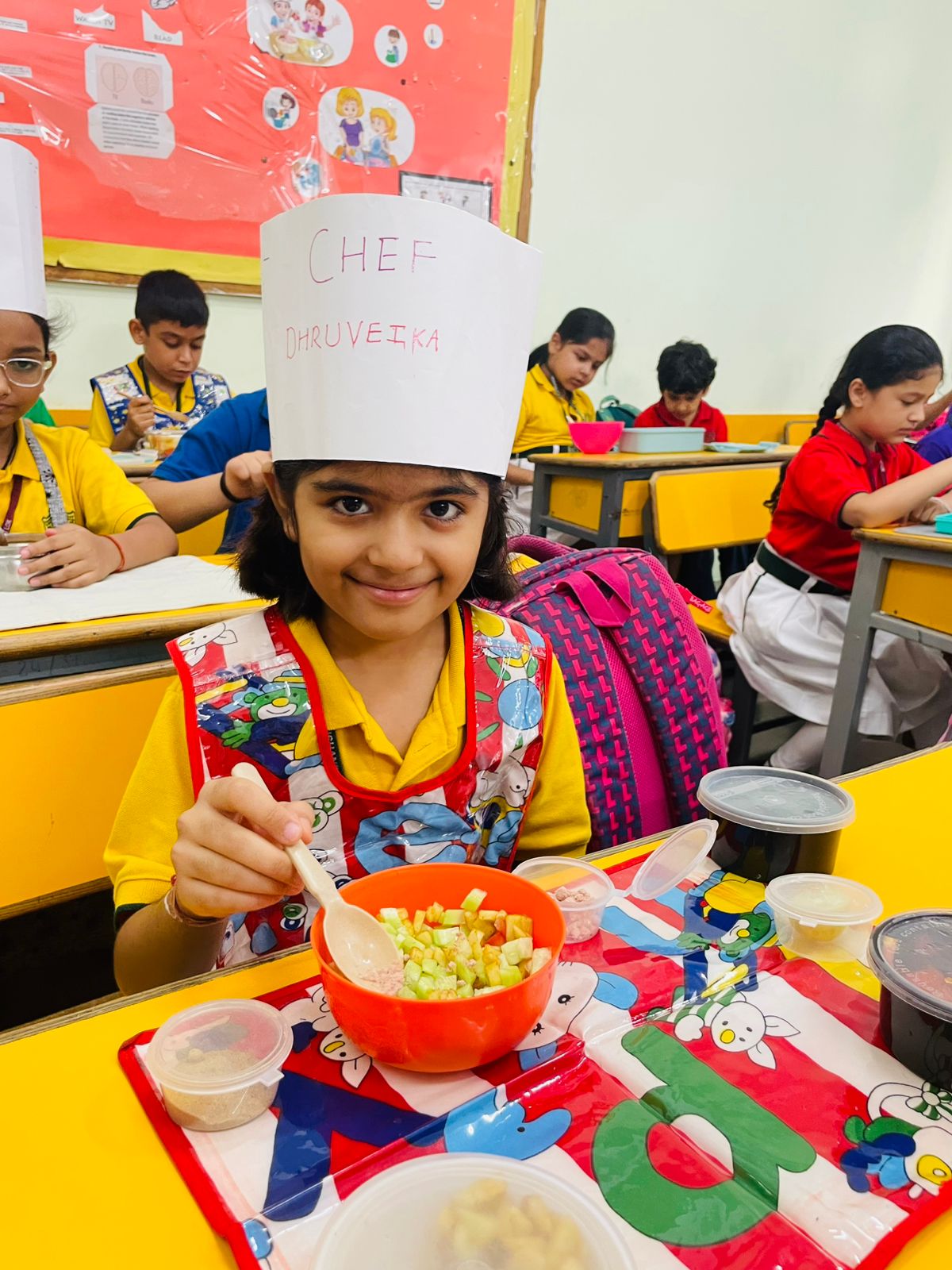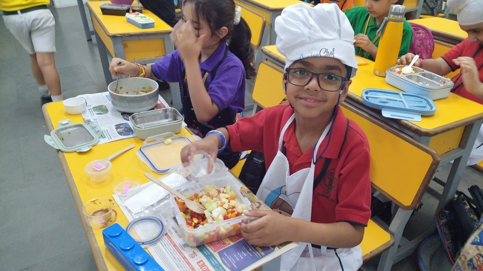 The classrooms were filled with excitement as young learners donned aprons and chef caps, ready to become little chefs for the day. They arrived equipped with a vibrant assortment of freshly chopped fruits and vegetables, along with seasonings like lemon, salt, and chaat masala.